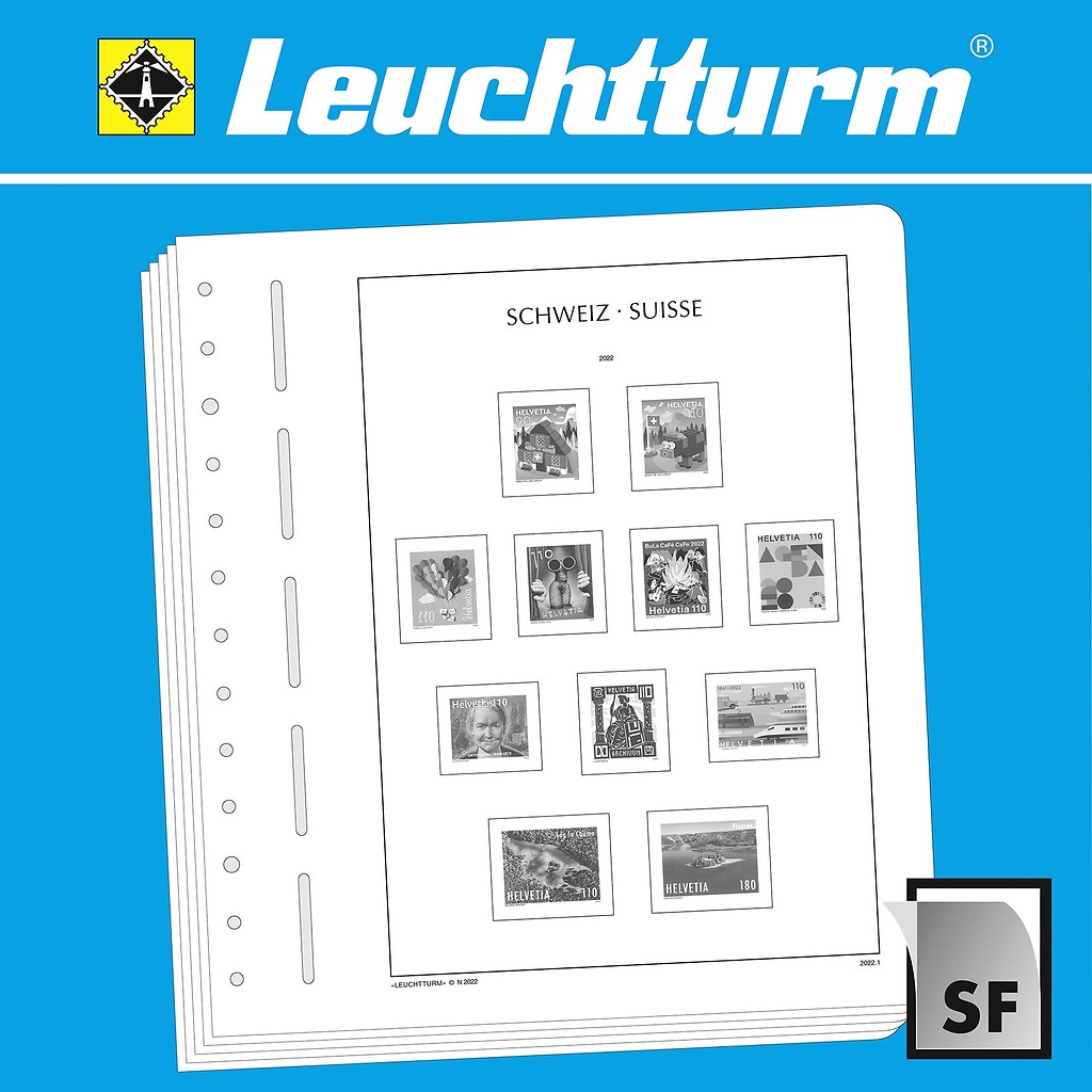 Los álbumes preimpresos LEUCHTTURM (formato 270 x 297 mm, perforación de 13 agujeros) están impresos en cartón de madera sin ácidos (170 g/m2), resistente al envejecimiento y con impresión offset en blanco y negro que reproduce fielmente los detalles. De esta forma, usted puede encontrar rápidamente los sellos que todavía le faltan. Sobre la impresión de los sellos y con el mismo tamaño, están pegados filoestuches-SF fabricados en poliestirol transparente, antireflectante y sin plastificantes. Estos filoestuches sujetan los sellos, a la vez que ofrecen una máxima protección contra el polvo y la humedad.