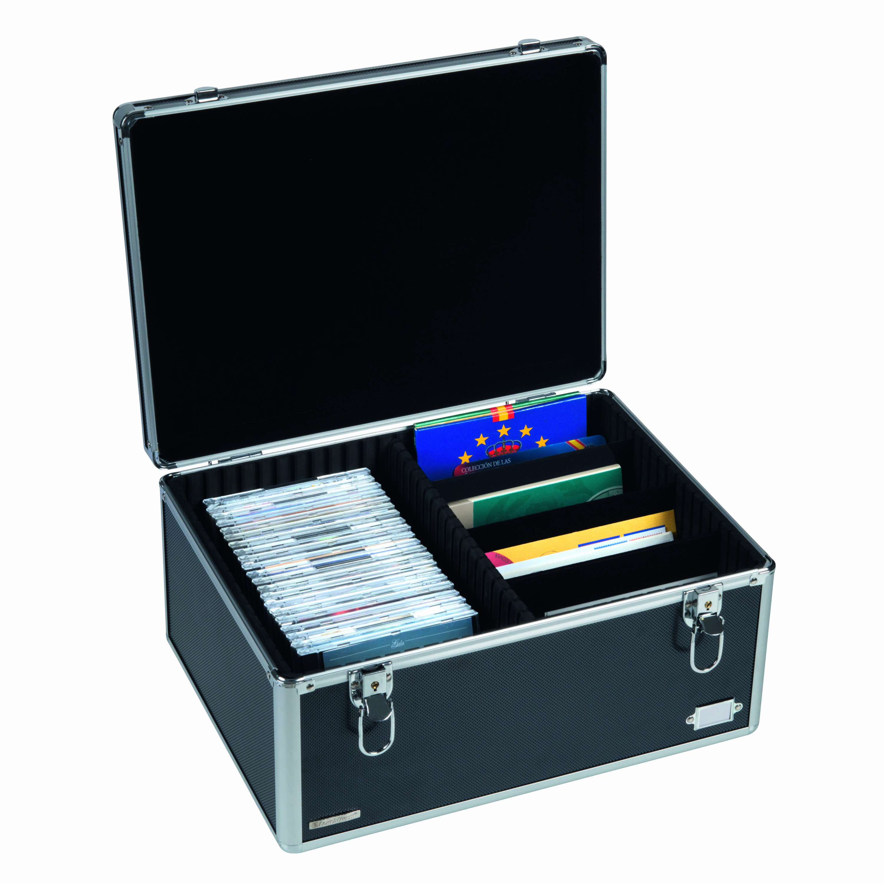 Maletín para guardar de forma cómoda y segura series de monedas, CD’s, tarjetas clasificadoras, postales, fundas para monedas, etc. Su flexible distribución interior ofrece sitio para objetos de coleccionismo de hasta 168 mm de alto y 370 mm de ancho.