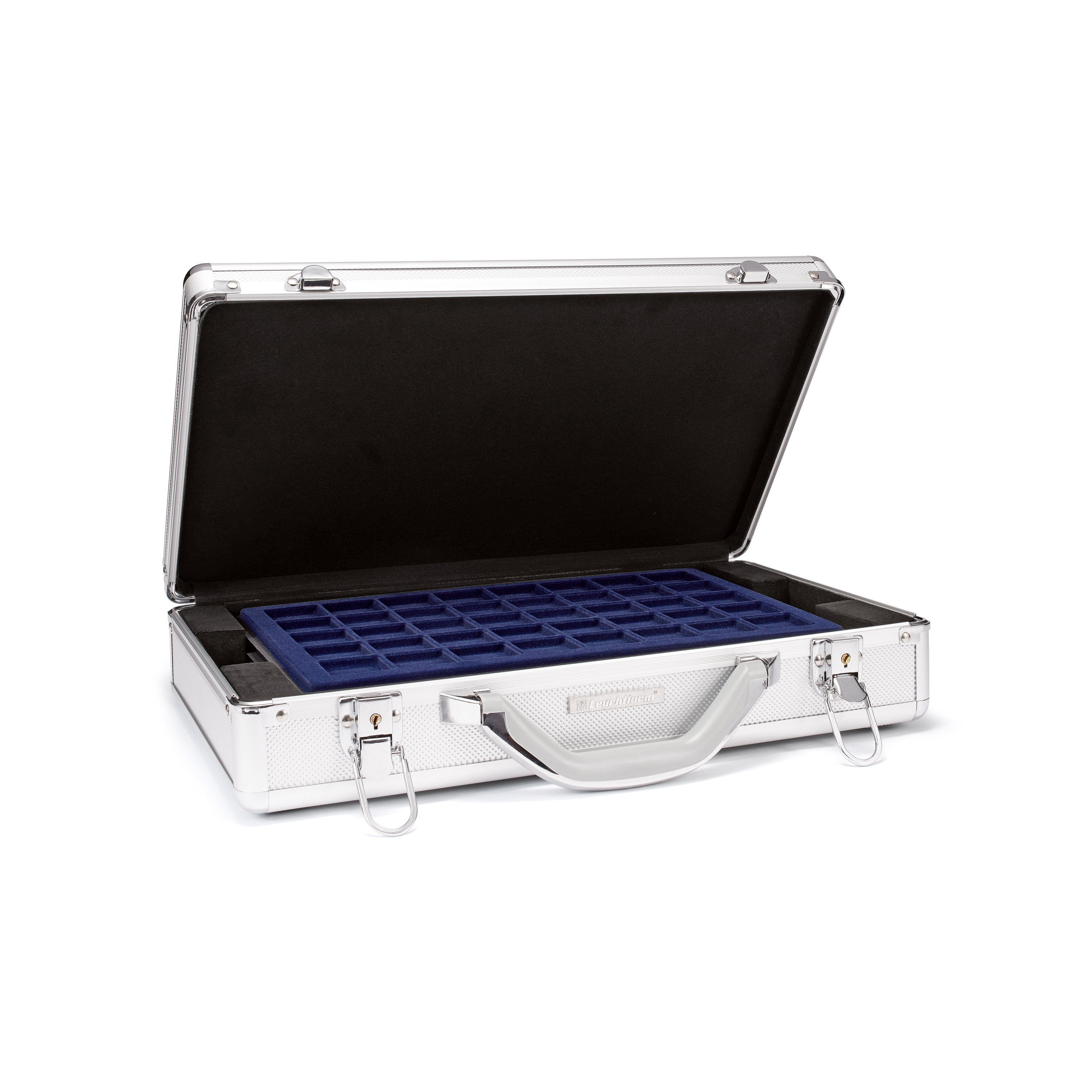 ¡La solución completa! Este maletín de aluminio incluye 6 bandejas para monedas de las medidas más frecuentes. Presentación: Interior forrado en imit. terciopelo azul. Doble cerradura (2 llaves), resistente asa ABS de material plástico. Formato exterior: 407 x 95 x 245 mm.