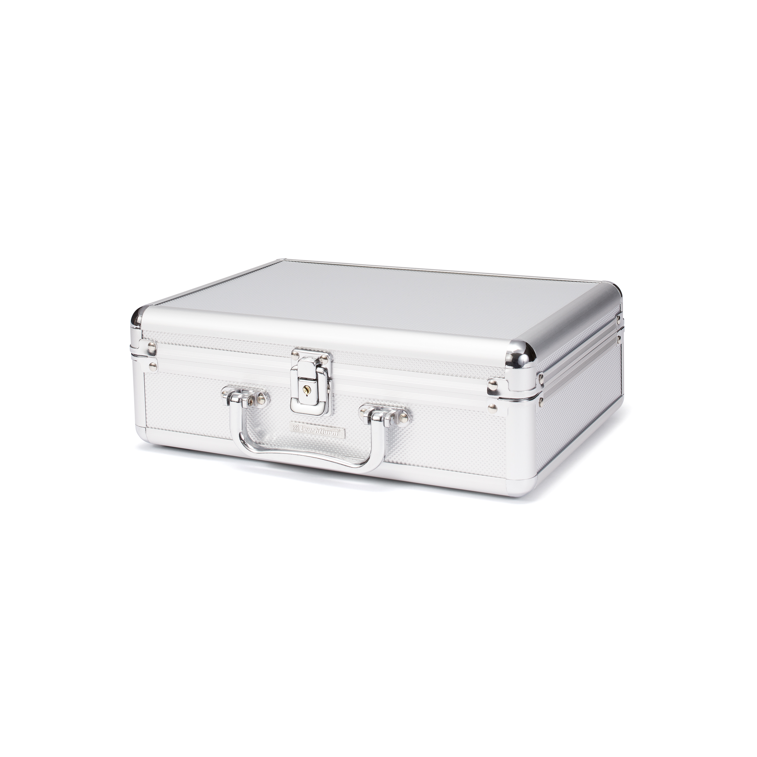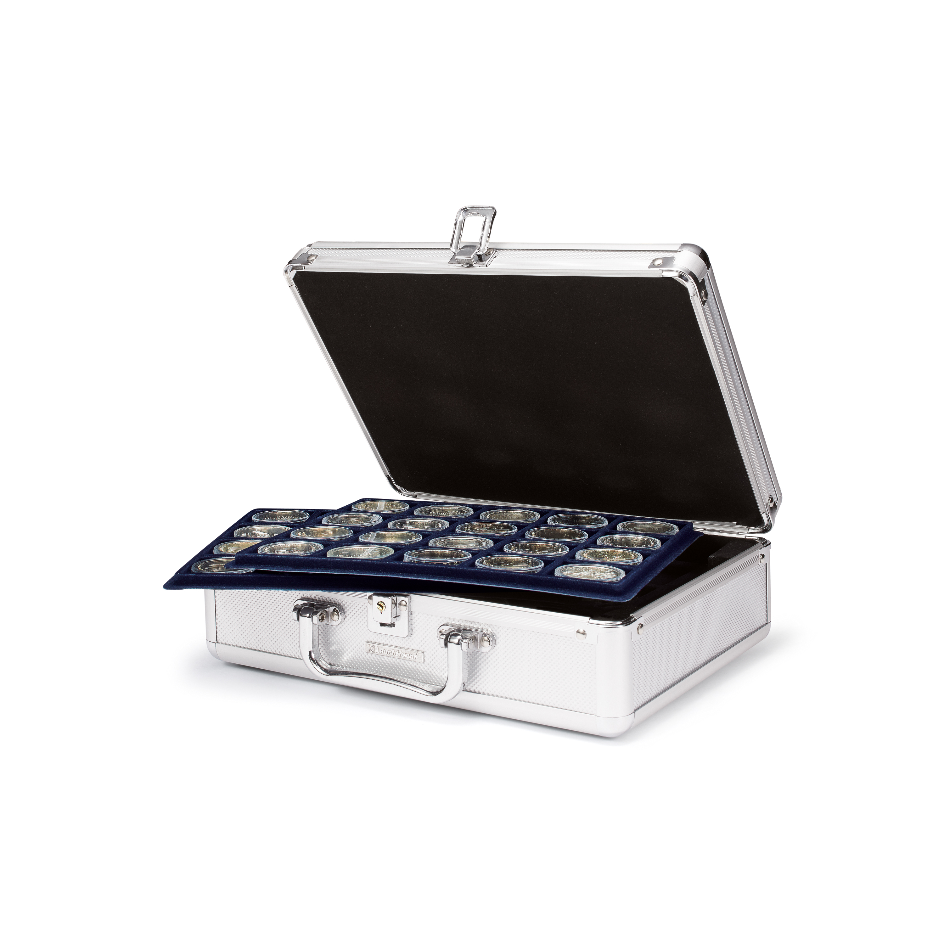 Nuestro estuche para monedas de alta calidad ofrece una opción de almacenamiento elegante y segura para su colección de monedas. El estuche impresiona por su elegante diseño en aspecto de aluminio plateado con una cubierta superficial en un llamativo dibujo de rombos. Los embellecedores redondeados de aluminio confieren al maletín estabilidad adicional y un aspecto moderno. Todos los materiales utilizados cuentan con la certificación SGS y cumplen la estricta norma medioambiental europea. El interior del estuche está forrado de terciopelo negro. Esto protege sus monedas de arañazos y las mantiene firmemente en su sitio, garantizando una presentación perfecta de su valiosa colección.