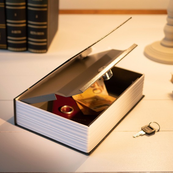 Caja fuerte en forma de libro, balanza de monedas & Co.