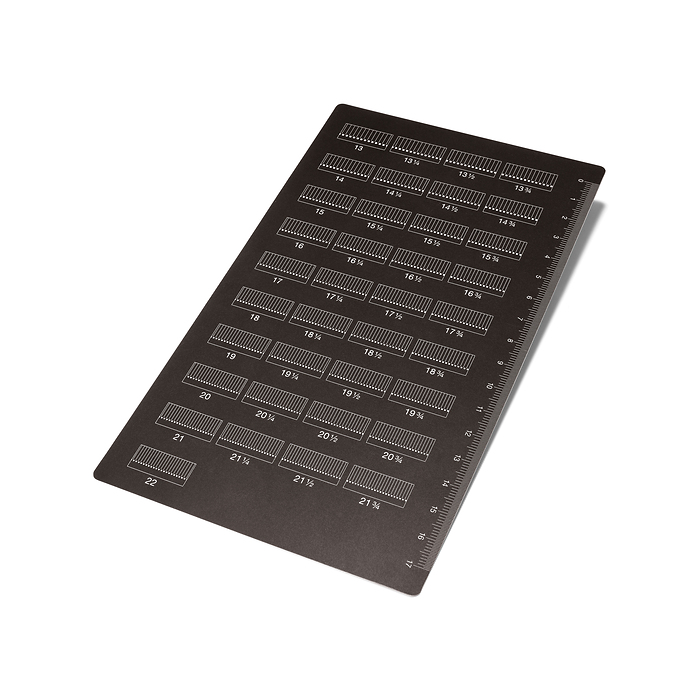 Odontómetro para medir el dentado de sellos. Basta con colocar el sello en la escala correspondiente hasta que las puntas de los dientes coincidan exactamente con los puntos y rayas. Recubierto de plástico. Formato exterior: 153 x 80 mm.