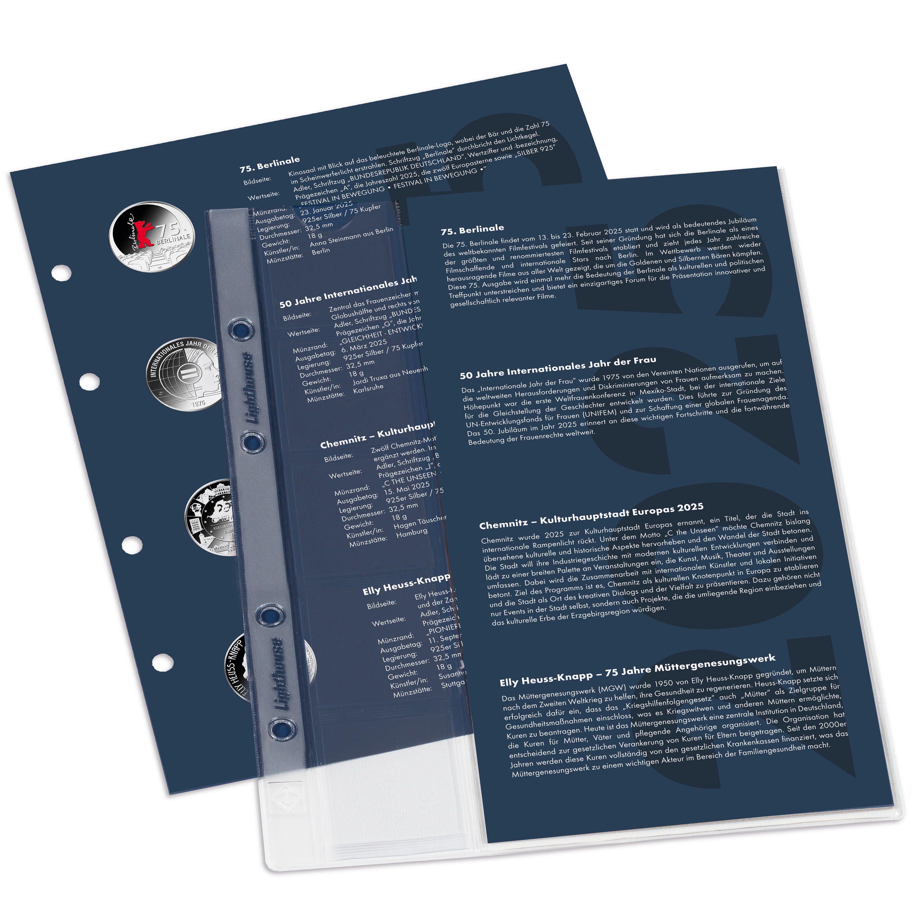 Nuestras hojas preimpresas incluyen imágenes e información detallada sobre el año en cuestión y se adaptan específicamente a las necesidades de los coleccionistas de monedas. Cada set incluye una hoja para monedas en formato 250 x 200 mm. Las hojas preimpresas incluyen imágenes e información sobre la moneda en cuestión. También hay una hoja adicional con información contextual detallada de las emisiones. Toda la información contextual está redactada en alemán.