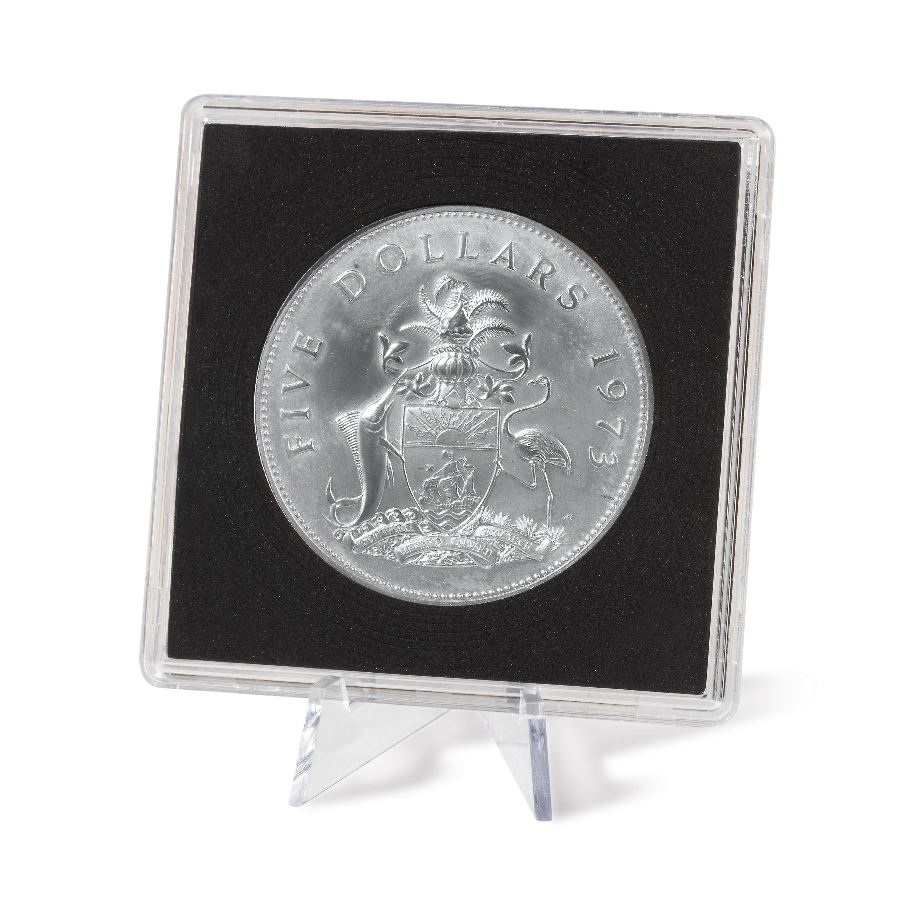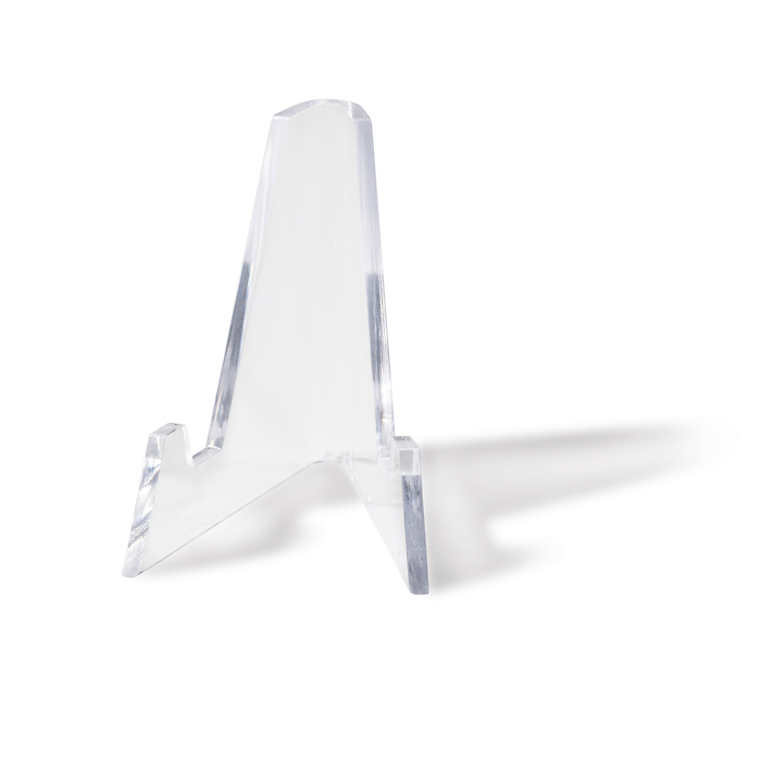 Soporte triangular de plástico muy transparente para monedas, medallas, cápsulas etc. Dimensiones: 38 mm de altura, 29 mm de ancho. Paquete de 5.