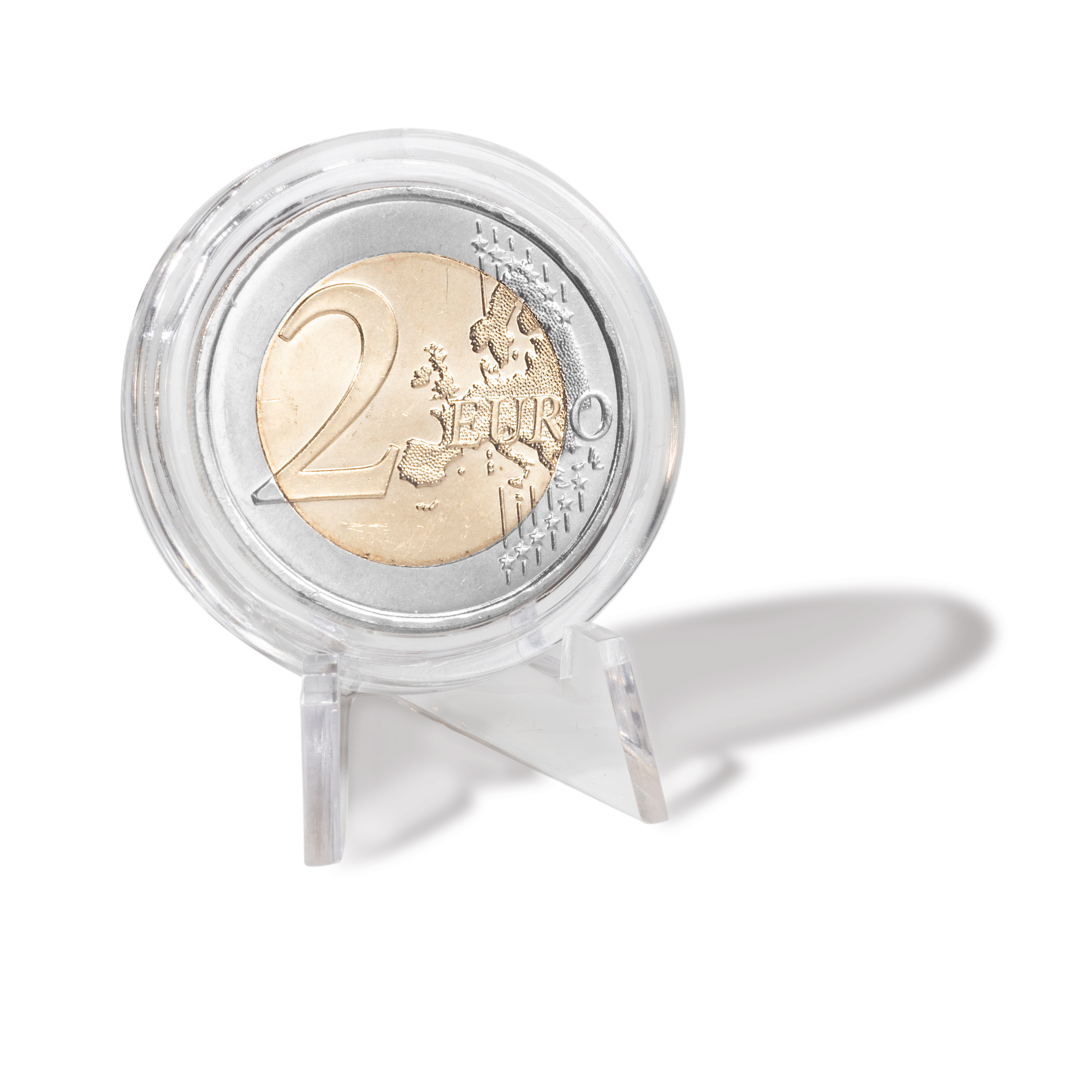 Soporte triangular de plástico muy transparente para monedas, medallas, cápsulas etc. Dimensiones: 26 mm de altura, 21 mm de ancho. Paquete de 5.