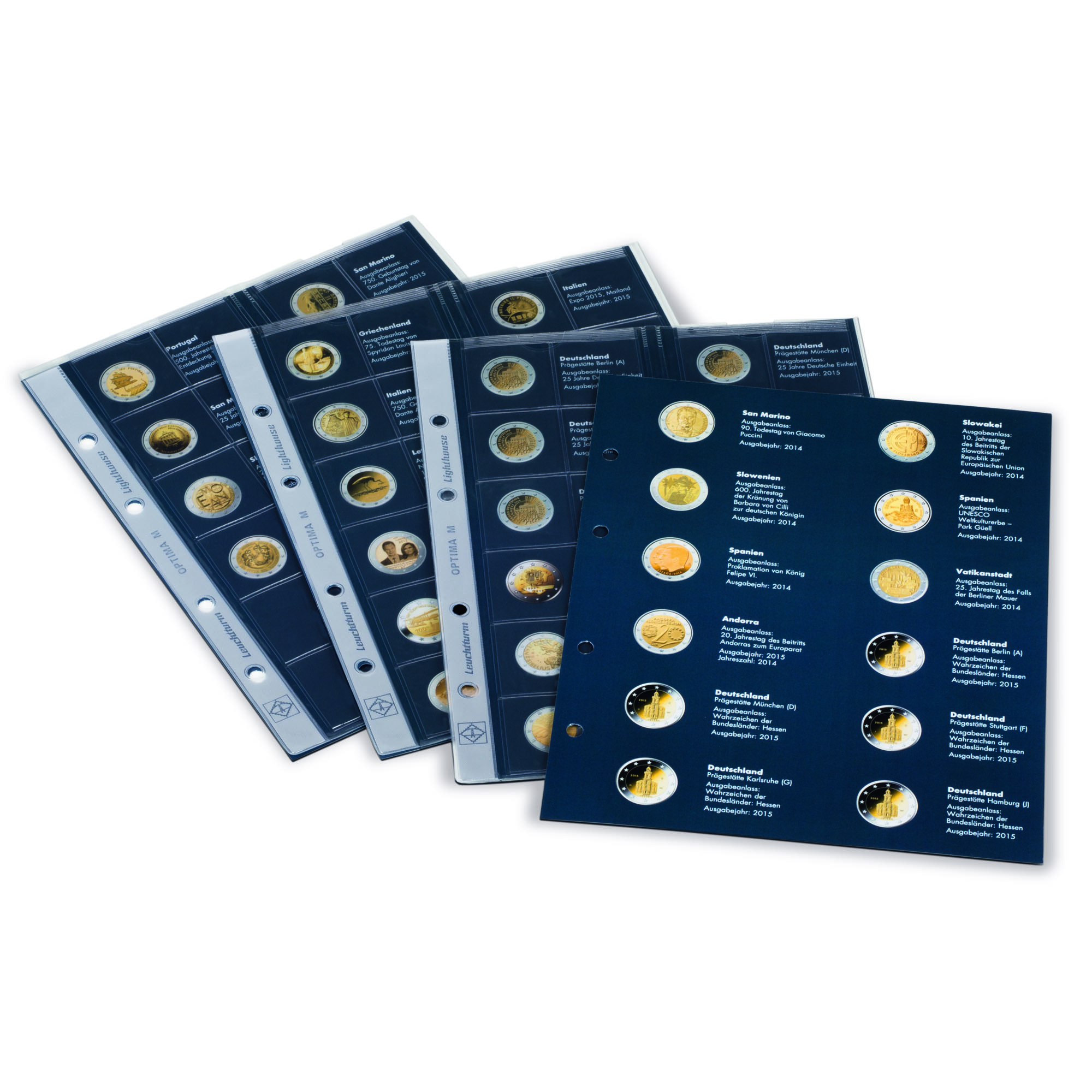 Nuestras hojas preimpresas ofrecen ilustraciones detalladas e información sobre el año correspondiente y están especialmente adaptadas a las necesidades de los coleccionistas de monedas. Cada juego contiene 4 hojas de monedas en formato 250 x 200 mm. Las hojas preimpresas incluyen ilustraciones e información sobre el año respectivo, teniendo en cuenta las 5 fábricas de moneda alemanas, a excepción de las emisiones conjuntas europeas de 2 euros. Toda la información de fondo está escrita en alemán.