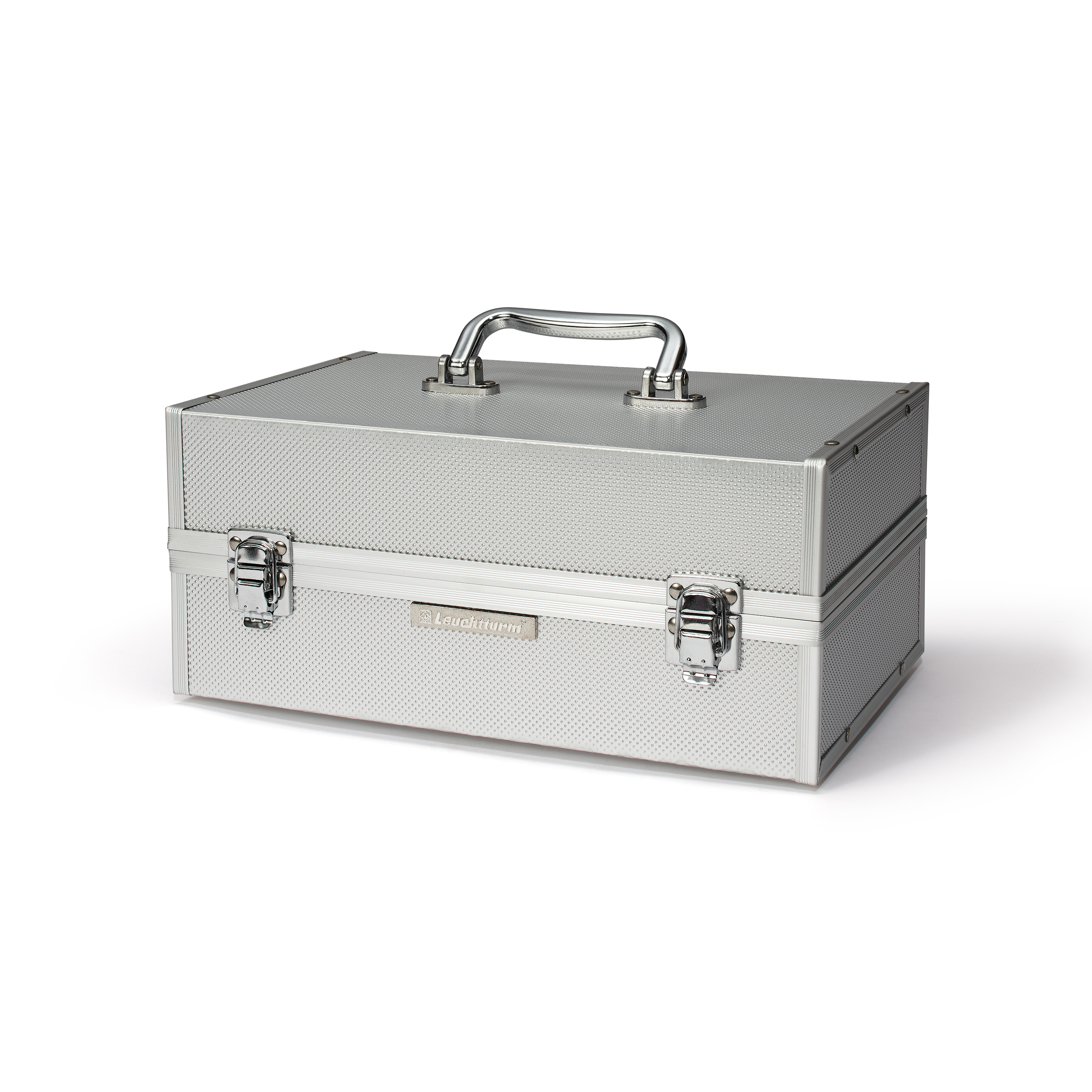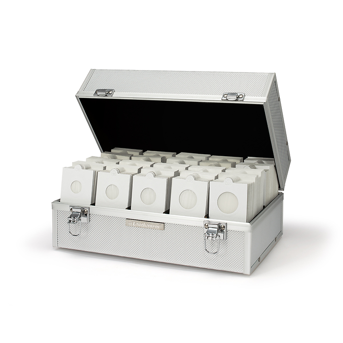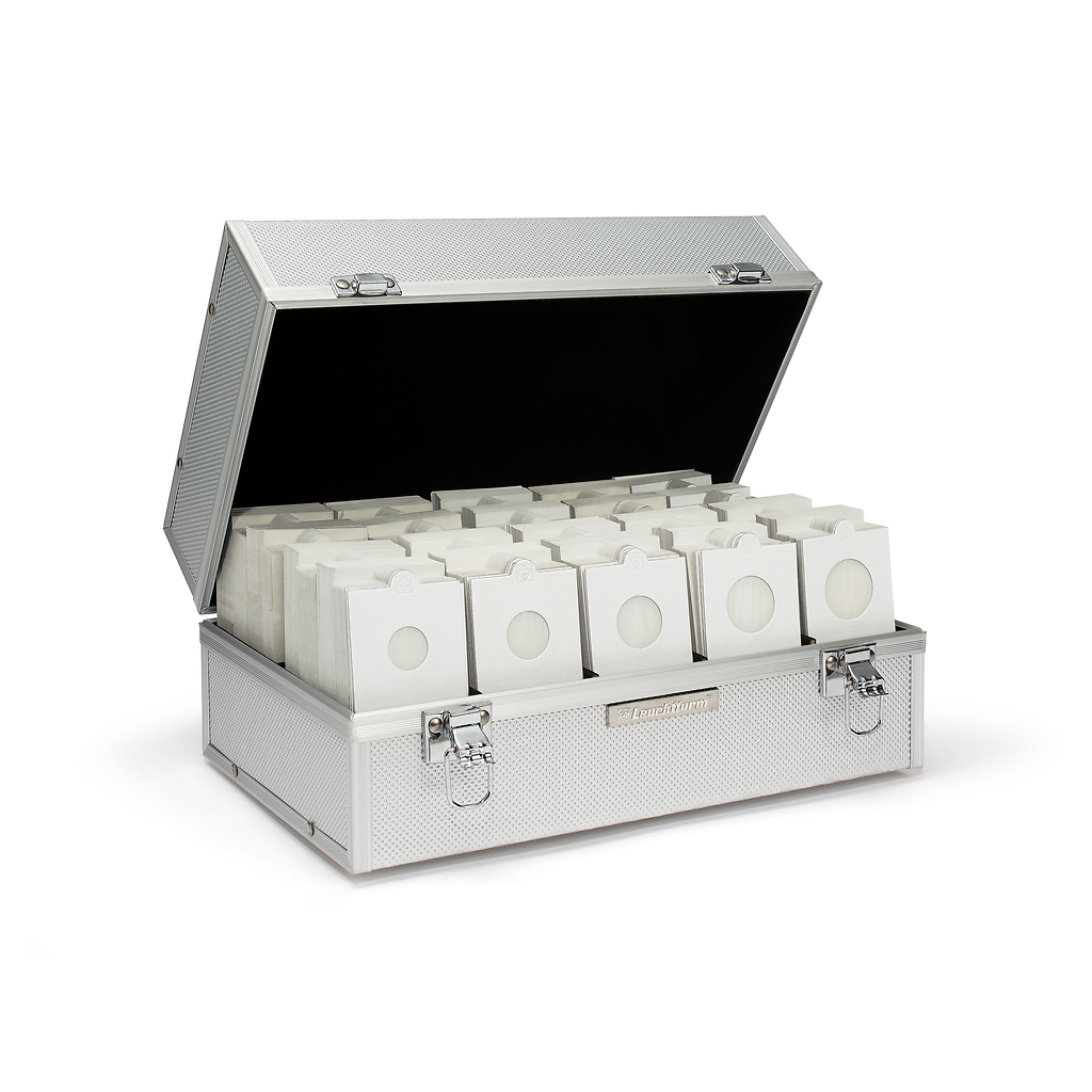 Para guardar los cartones de monedas, recibirá totalmente GRATIS un práctico maletín diseñado en aluminio para clasificar sus cartones de forma clara y atractiva. Además, el maletín es ideal para transportarlos. El robusto armazón está reforzado con protectores de aluminio en las esquinas. El interior del maletín está completamente forrado de terciopelo negro.