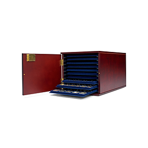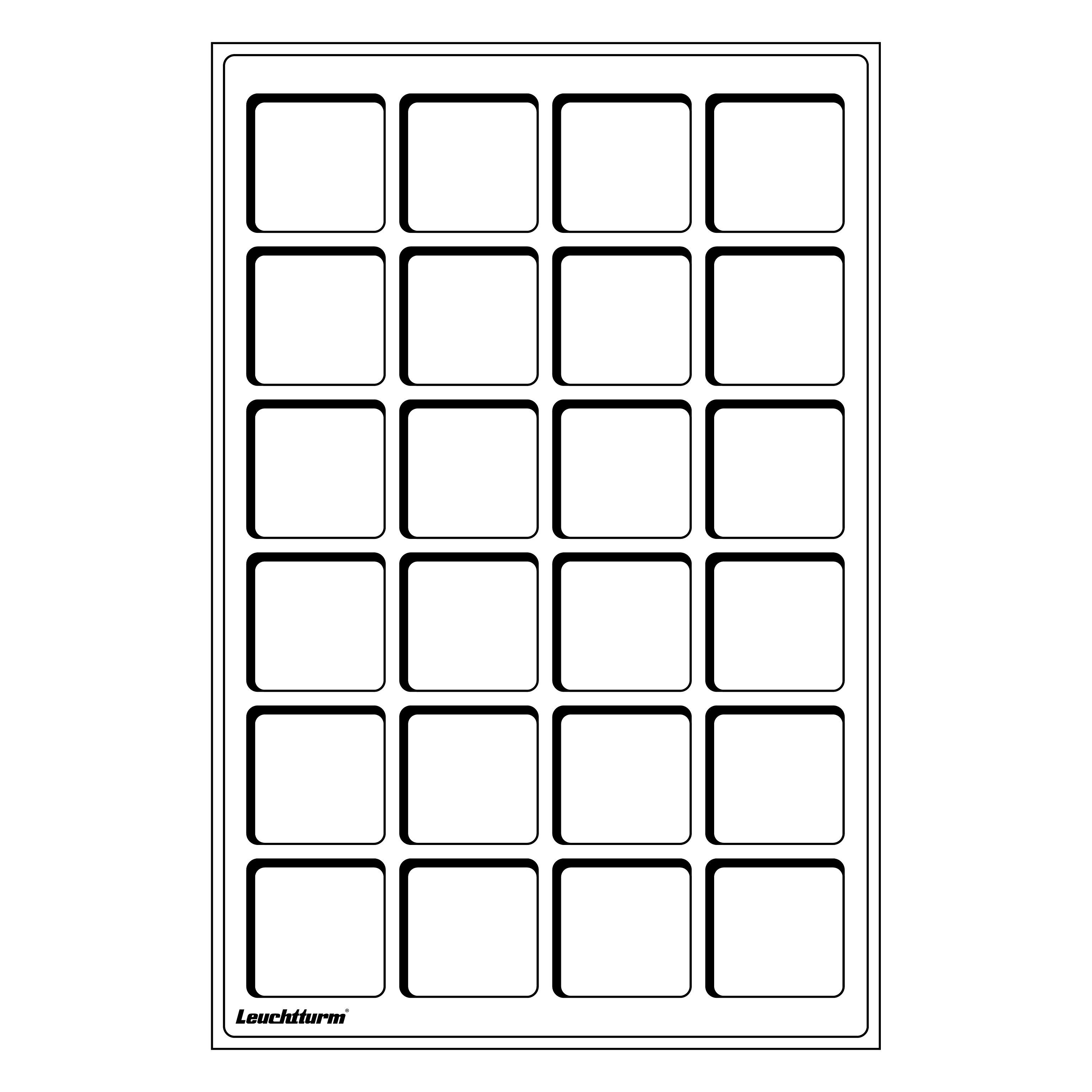 Bandeja con 24 divisiones esquinadas para 24 monedas hasta de 47 mm Ø. Bandeja forrada de aterciopelado. Apta para maletín CARGO L6, CARGO L12 (vacío) + cajetín L, también para plaquitas de casino. Color: azul o rojo.