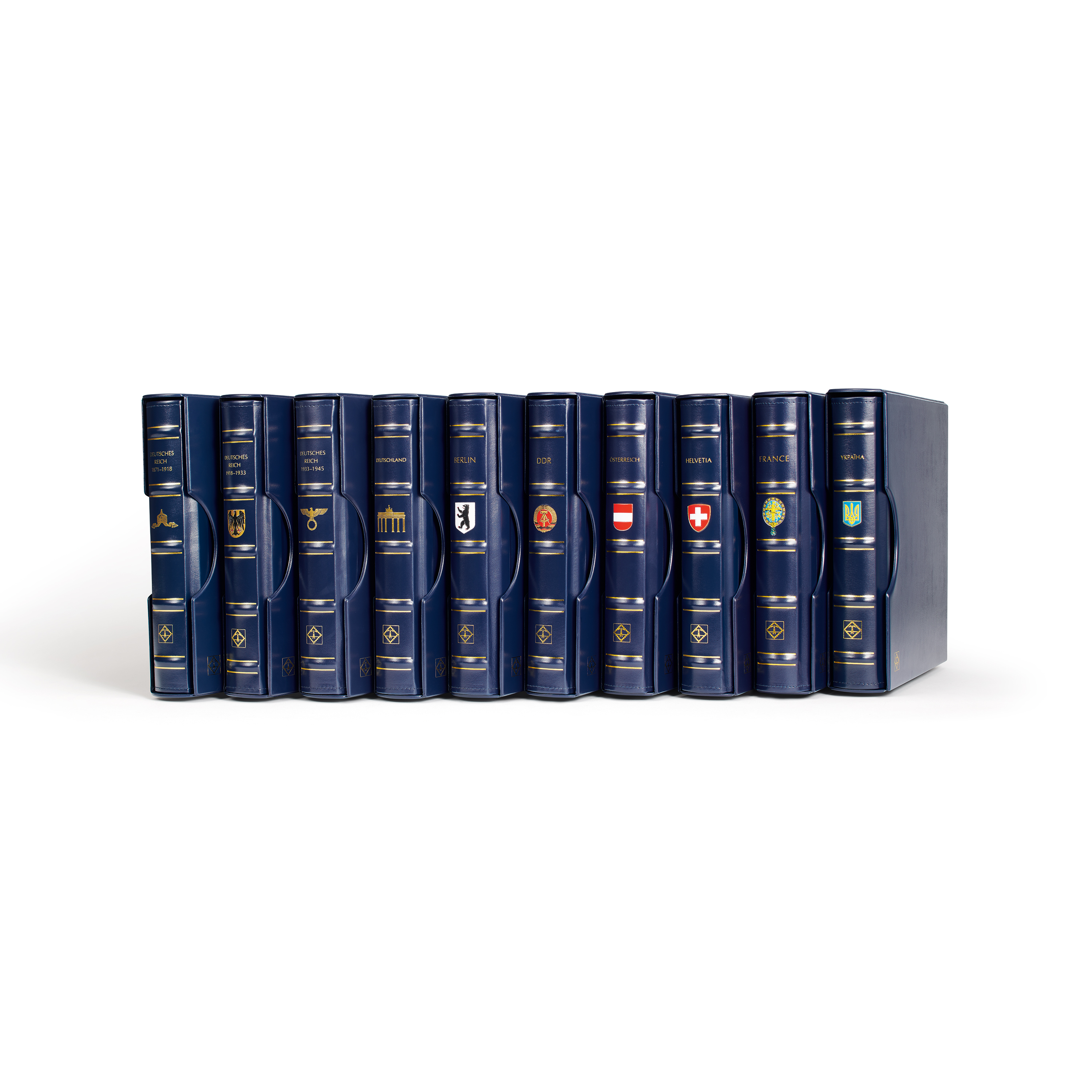 Poseen todas las cualidades de las tapas de barra rotativa PERFECT, como p.ej. una capacidad de hasta 120 páginas. Junto con el cajetín protector ofrecen la perfecta relación calidad-precio. Grabado en color oro en el lomo, escudo incluido. Grabado en la tapa: escudo y nombre del país en color oro.