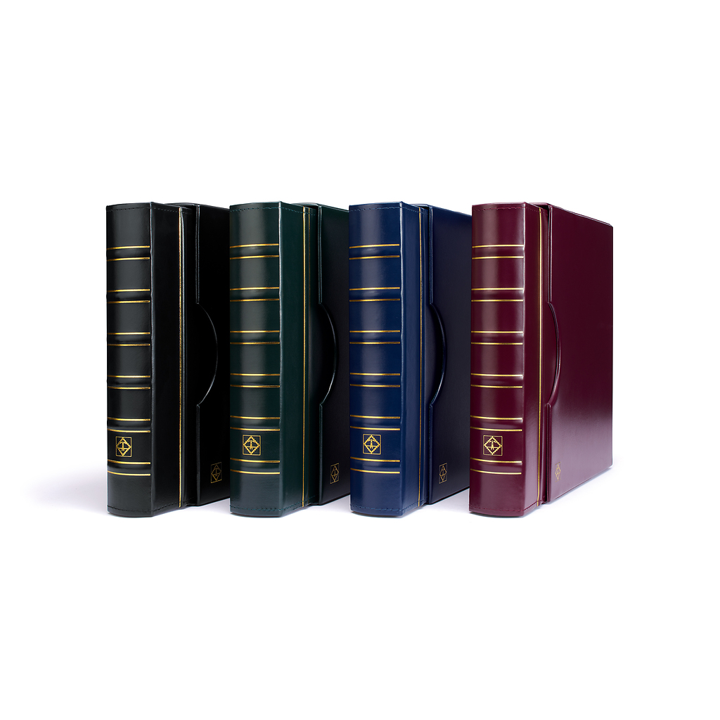 álbum GRANDE son ideales para guardar billetes de banco, hojas NUMIS, carnets y cualquier documento en formato DIN-A4. Incluye cajetín protector. Formato exterior: 295 x 335 x 70 mm. No incluye hojas.