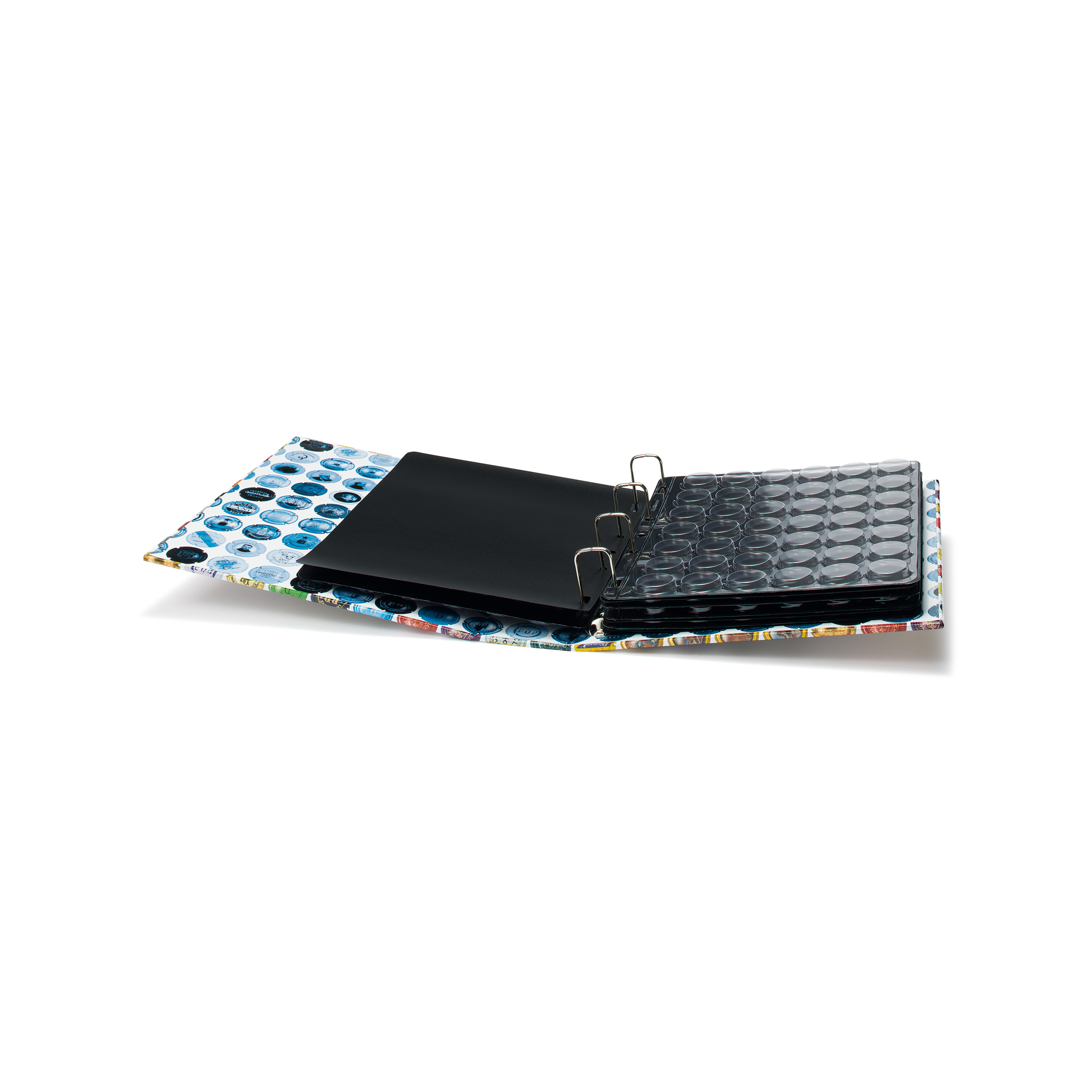 Álbum GRANDE para placas de cava. Contiene 5 hojas negras para un total de 210 placas de cava. Puede complementar su álbum añadiendo nuestras hojas suplementarias (capacidad total: 9 hojas = 378 placas de cava). Con mecanismo de asa lineal de 4 anillas.
