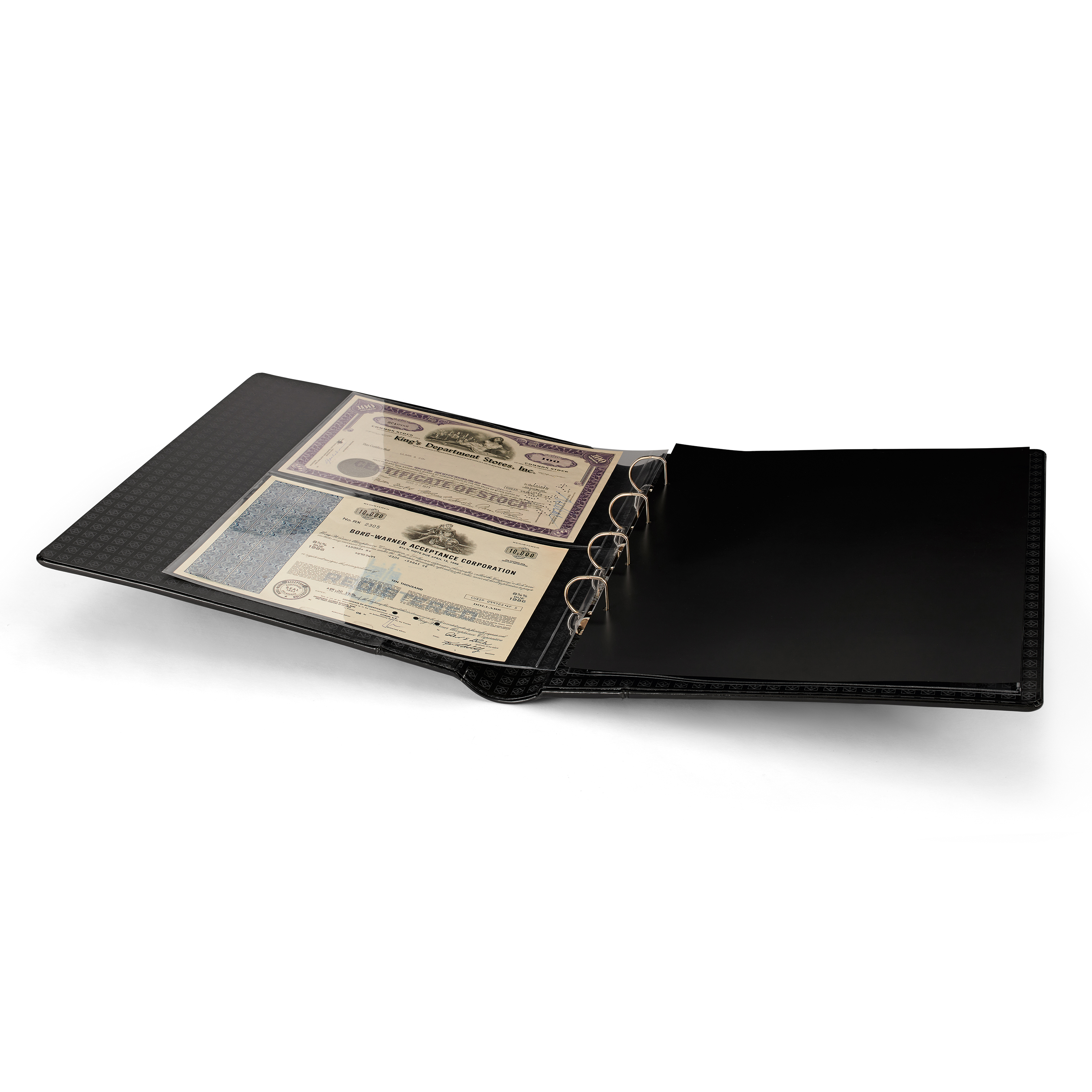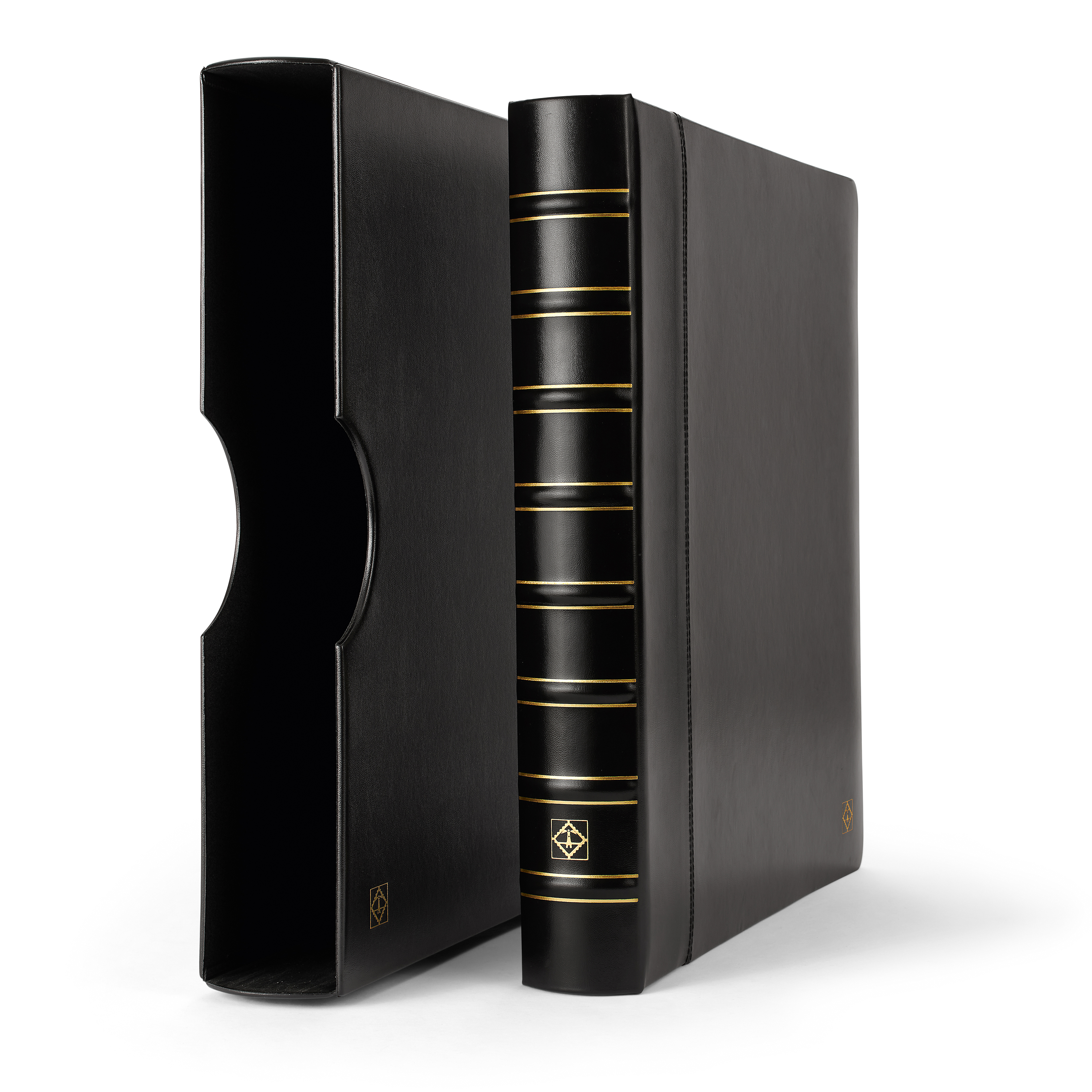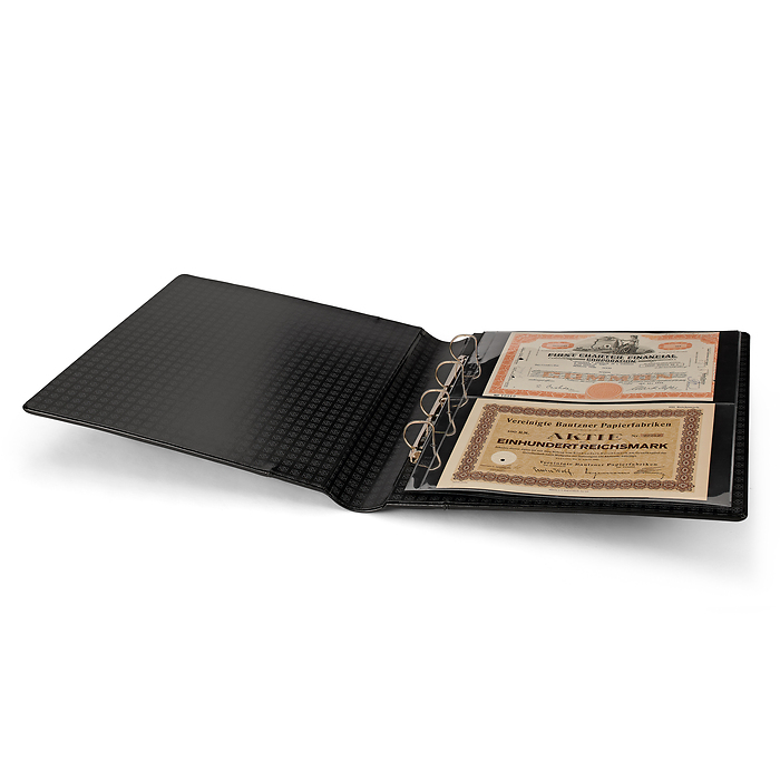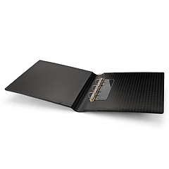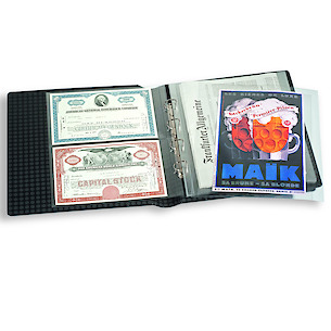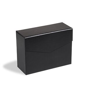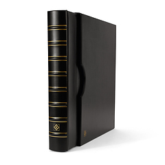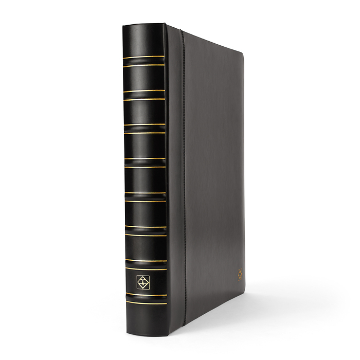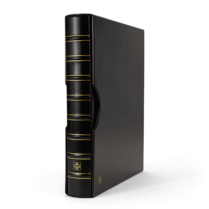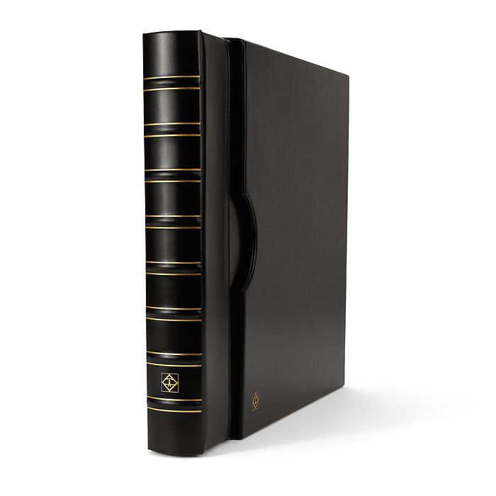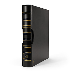 Elegantes tapas de álbum con anillas con formato extra grande para guardar de forma segura y cómoda documentos de hasta 330 x 420 mm (adecuado para el formato histórico "Kanzlei" o "Doppelfolio"). También para documentos en formato DIN A3 como títulos, carteles o periódicos. Tapas resistentes gracias a su elaborada encuadernación y al mecanismo de 4 anillas D. Encuadernación de alta calidad en imitación a cuero negro. Color negro. Con cajetín protector. Formato exterior del cajetín: 425 x 470 x 80 mm.