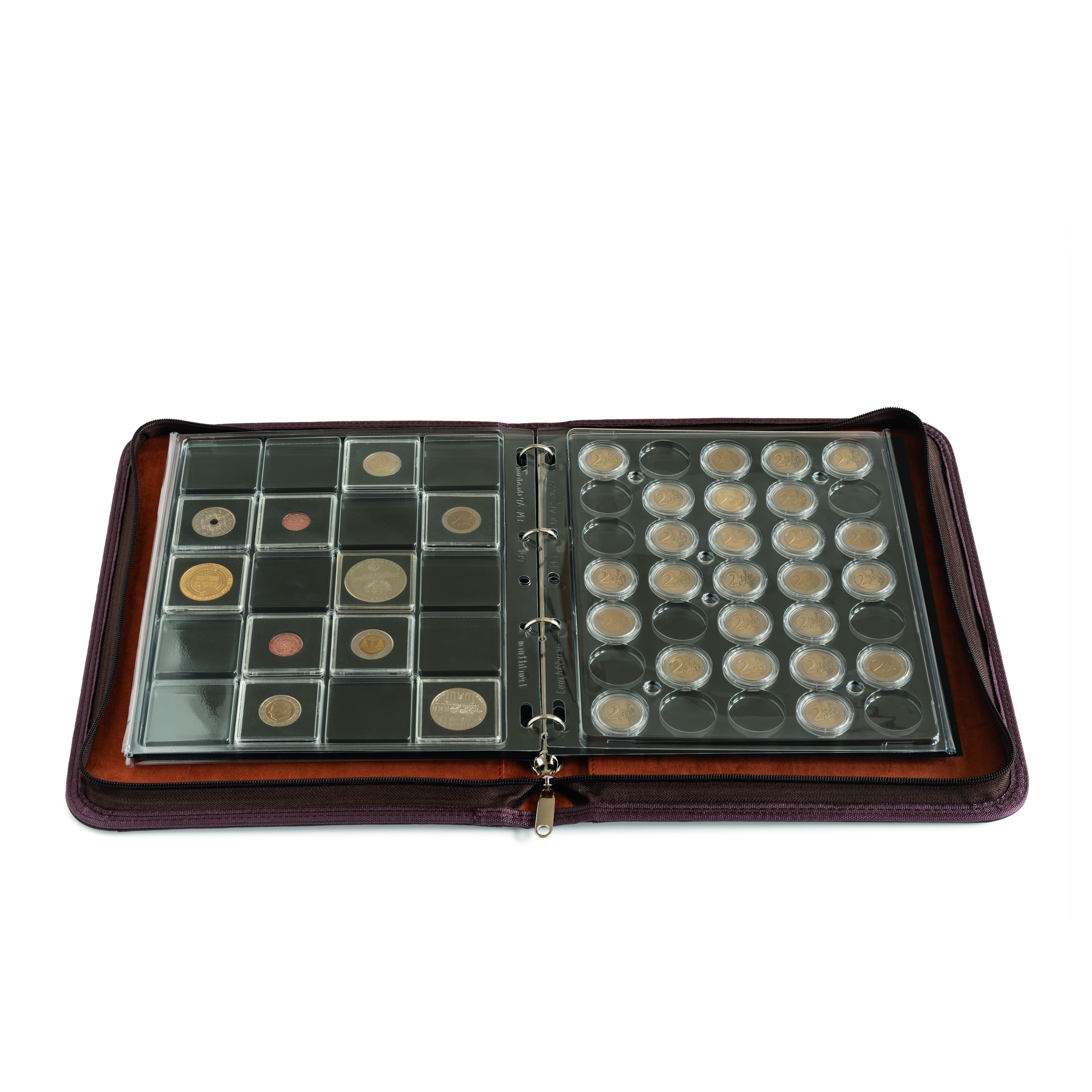 Carpeta de anillas de alta calidad "KURT" con aspecto de cuero para almacenar monedas, sellos, billetes, tarjetas postales y mucho más. Gracias a su resistente cremallera, su colección estará óptimamente protegida contra posibles daños y pérdidas. Capacidad: hasta 30 fundas GRANDE o fundas para monedas 3 ENCAP. Robusto mecanismo de anillas 4D.