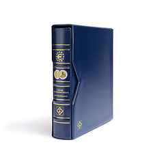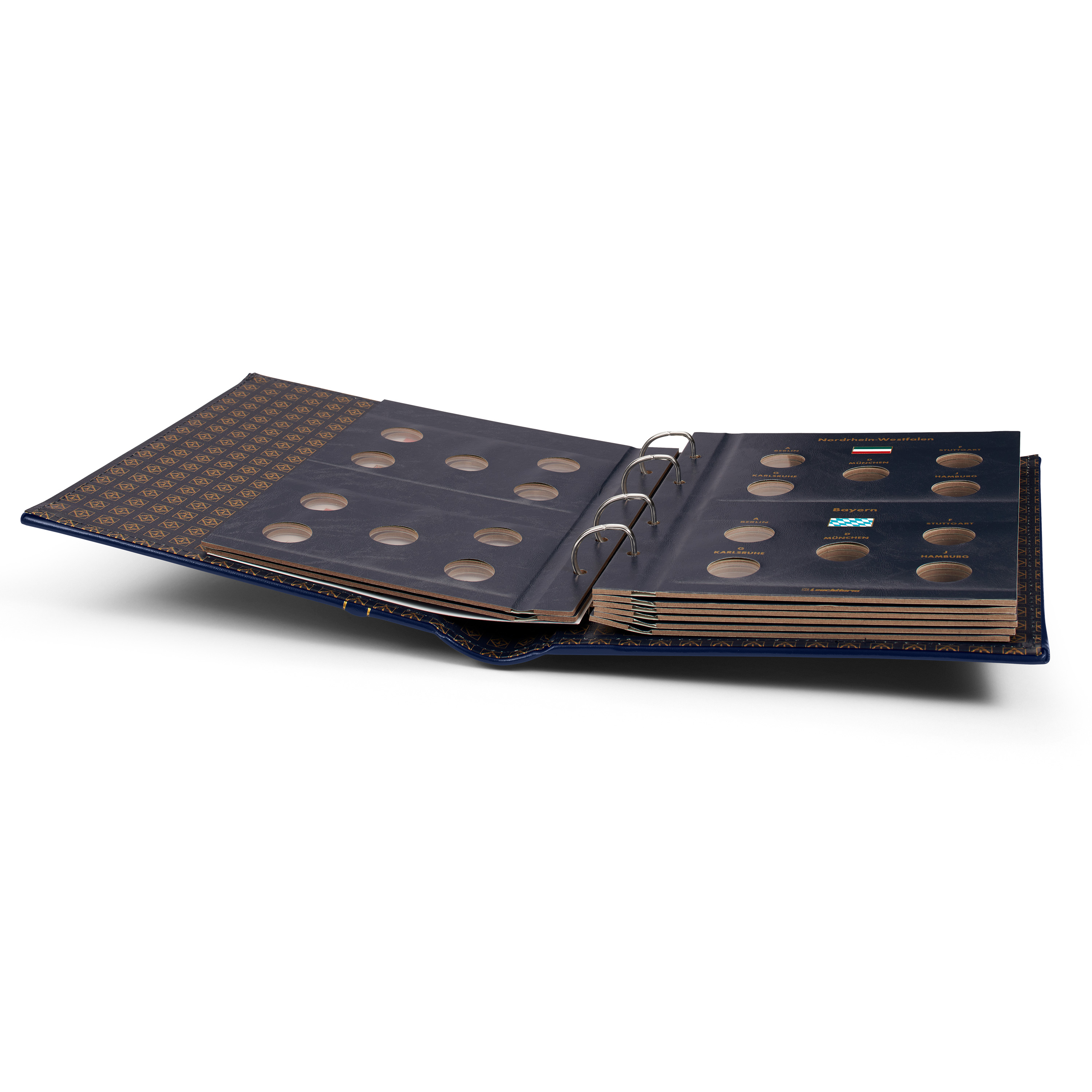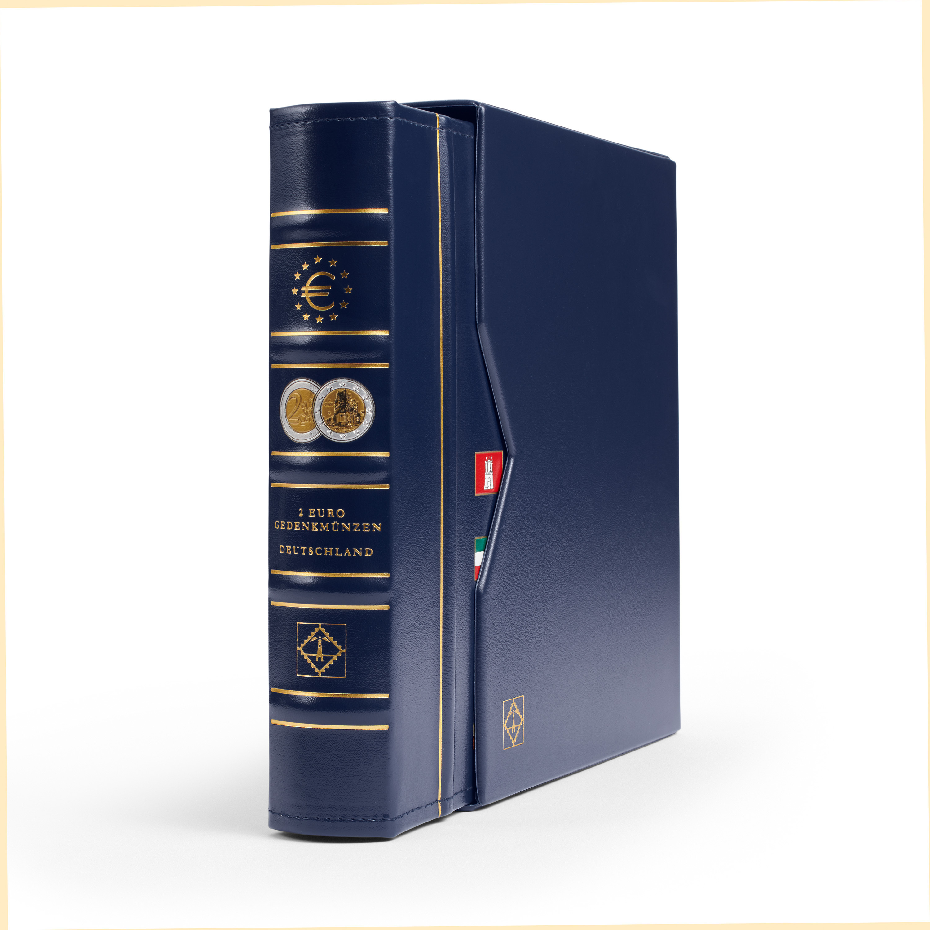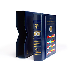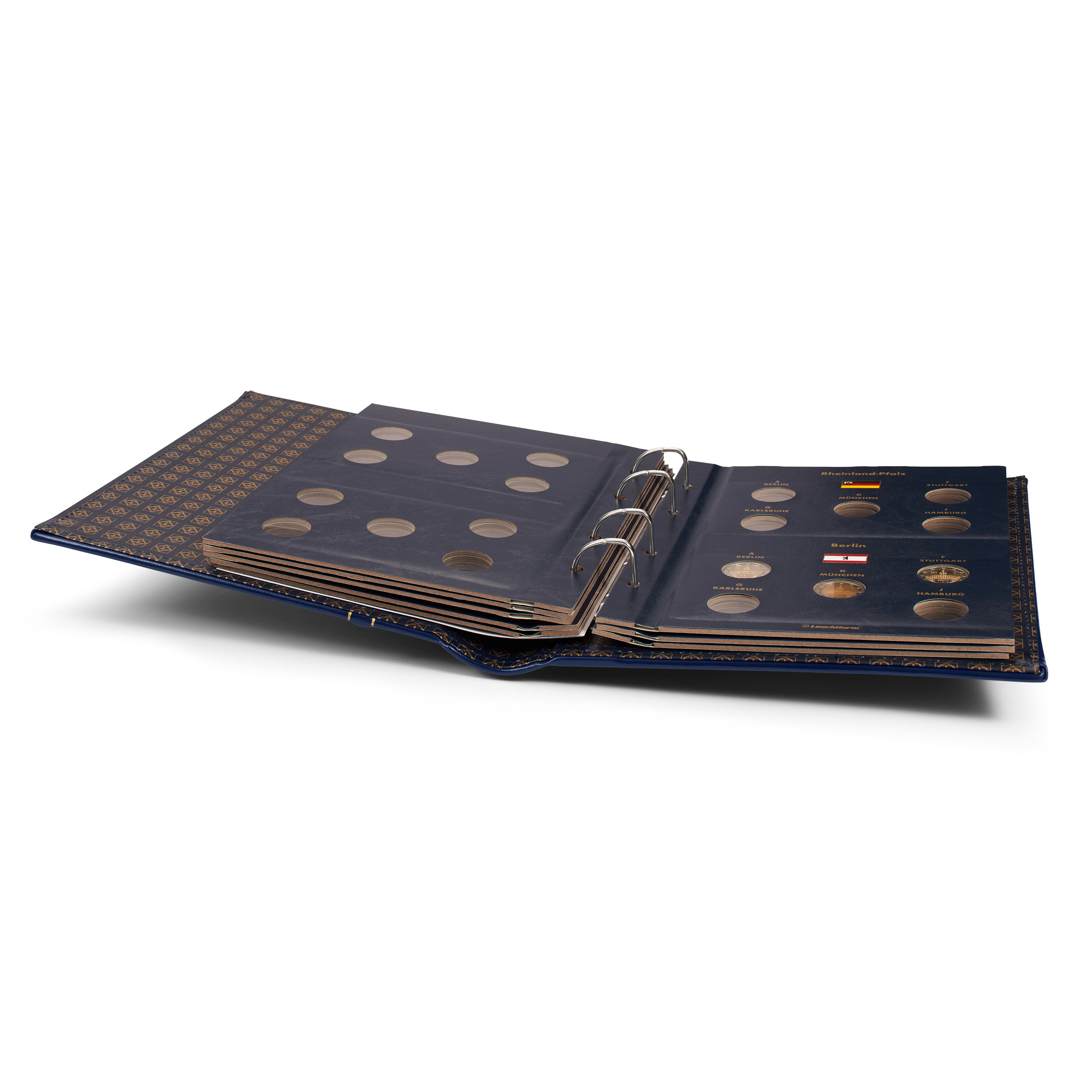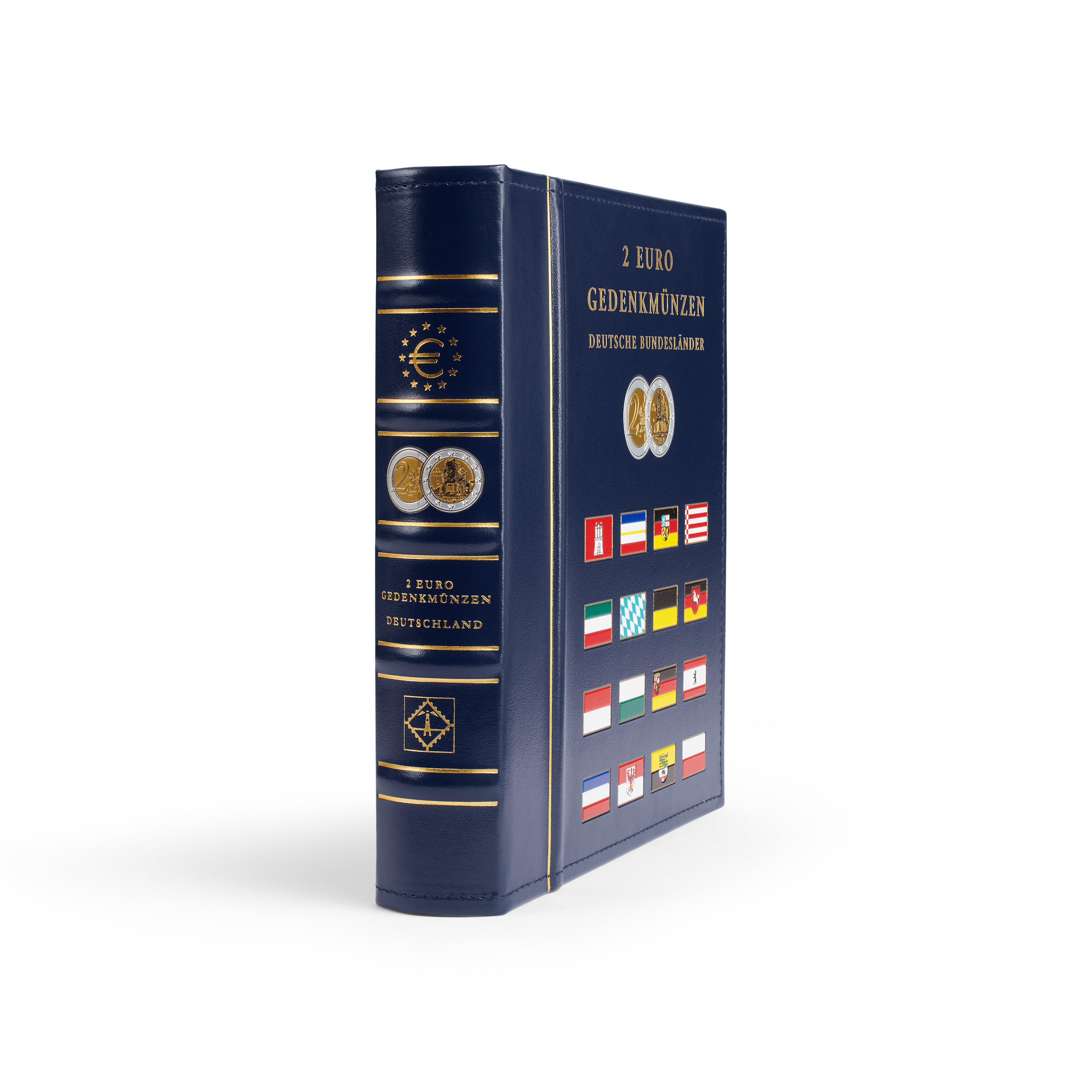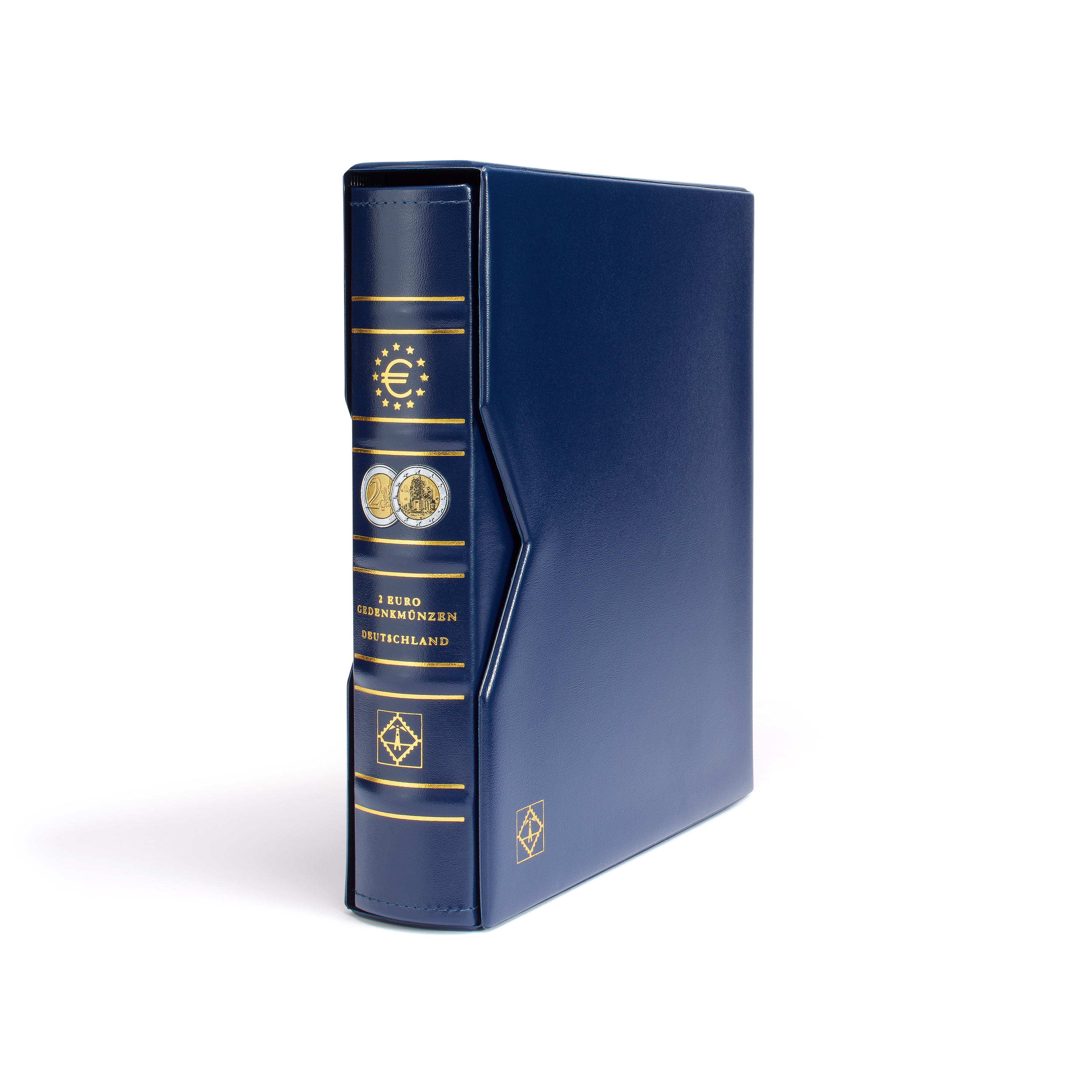 Para guardar de forma cómoda monedas conmemorativas alemanas de 2 euros de la 1ª o 2ª serie «Estados Federados alemanes». Con unas elegantes tapas en imitación a piel con elegantes grabados en la portada y en el lomo. Contenido: 8 hojas VISTA, cada una para 2 sets de alguna de las dos series alemanas de 2 euros. Con cajetín protector a juego. Tamaño exterior: 250 x 280 x 65 mm.