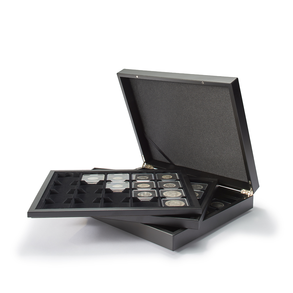 Estuche de primera calidad de color negro para guardar 60 cápsulas de monedas QUADRUM o cartones de monedas. 3 bandejas con superficie aterciopelada de color negro, cada una con 20 divisiones cuadradas (50 x 50 mm). Los bordes de madera de las bandejas proporcionan una gran resistencia. Interior de la tapa acolchado con raso negro. Con un cierre magnético seguro y discreto. Formato exterior: 330 x 270 x 55 mm.