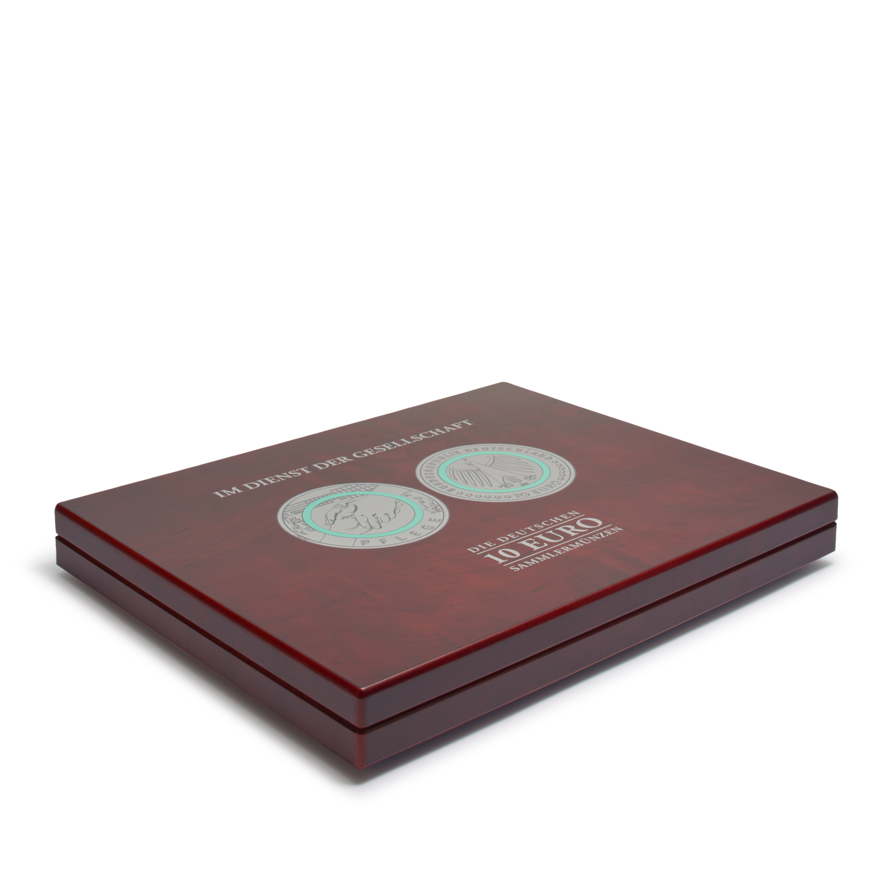 Este estuche de alta calidad, en color caoba, permite almacenar hasta 25 monedas alemanas de colección de 10 euros (cecas A, D, F, G, J) de la serie " En servicio de la sociedad" en cápsulas.