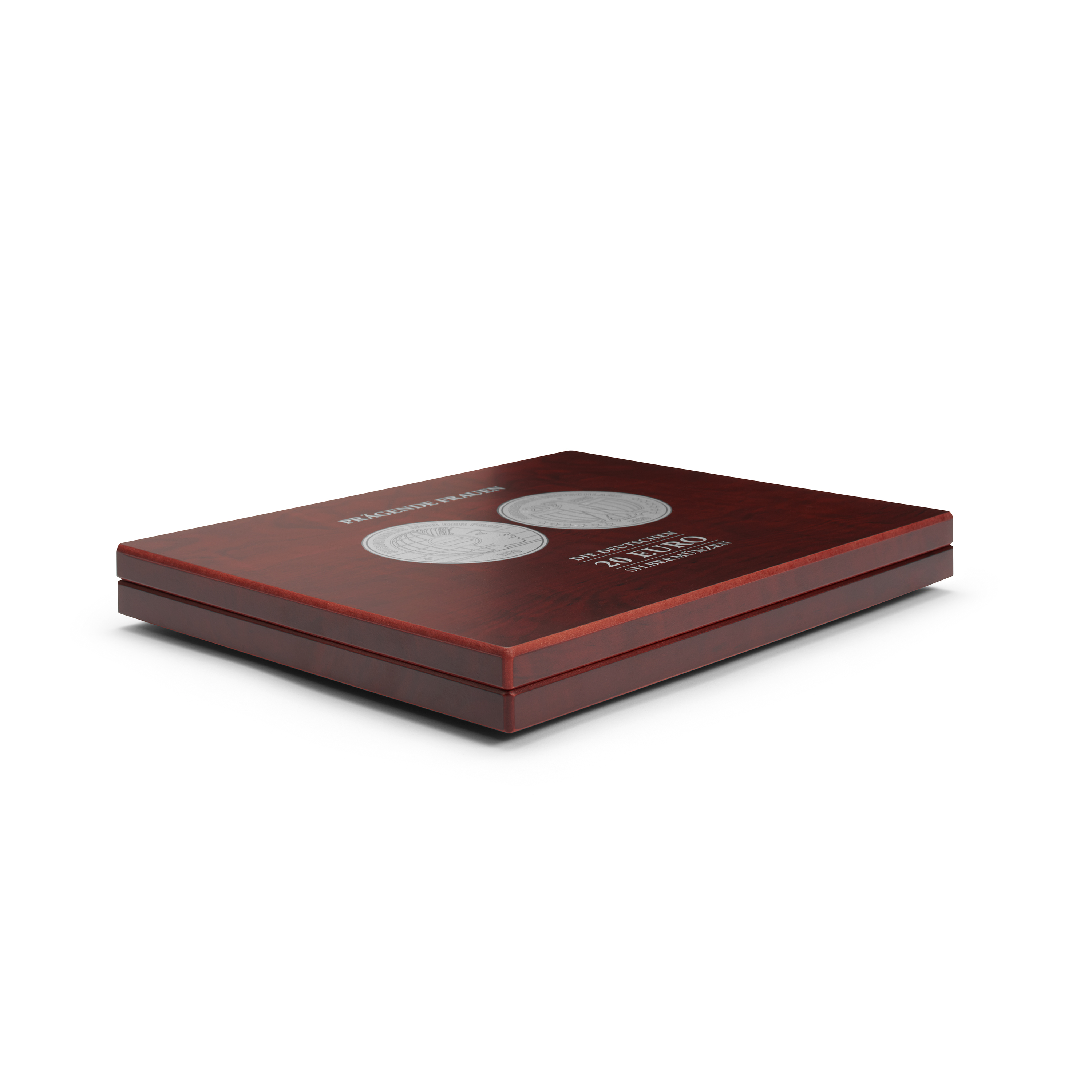 Número de artículo: 372277• Estuche de MDF para 12 monedas conmemorativas alemanas de 20/35 euros «Acuñadoras», en cápsulas