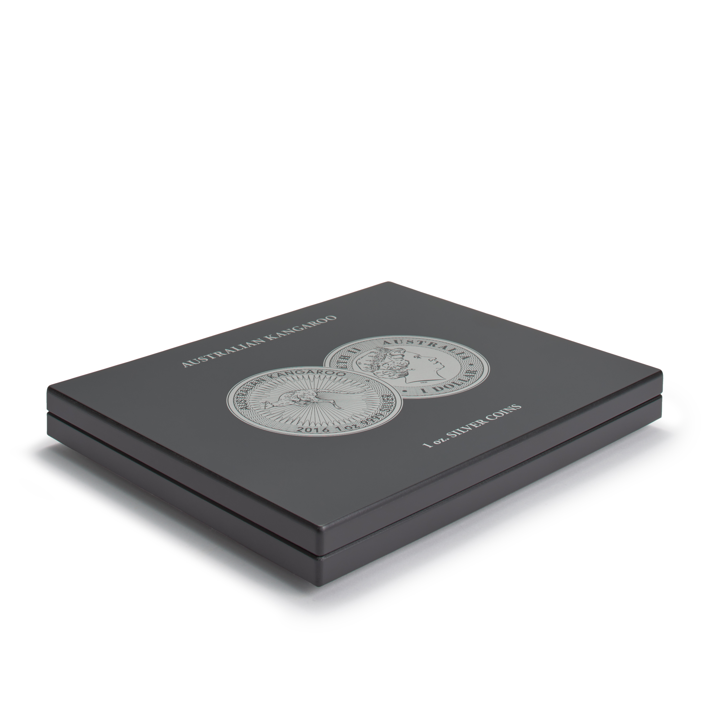Elegante estuche de color negro para 20 monedas de plata Australian Kangaroo (modelo de 1 oz.) en cápsulas (Ø interior 41 mm). 1 bandeja con superficie aterciopelada de color negro y 20 divisiones redondas (Ø 47,5 mm). Con grabados en color plata en la tapa y en su parte interior con motivo de la moneda. Interior de la tapa acolchado con raso negro. Con un cierre magnético seguro y discreto. Tamaño exterior: 305 x 30 x 245 mm.