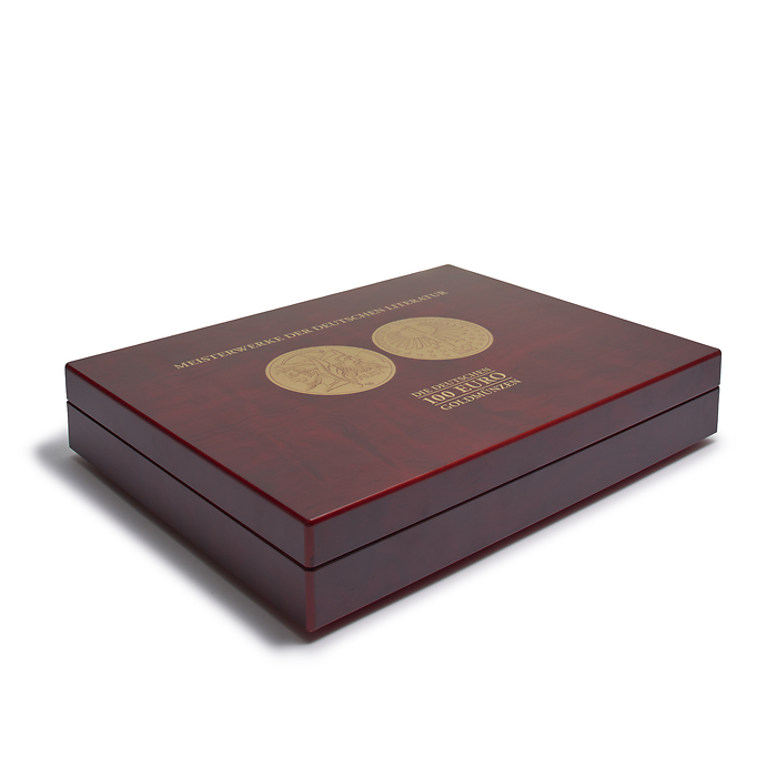 Hasta ahora, los coleccionistas tenían el problema de que no podían guardar estos estuches junto con las monedas de una forma estéticamente bonita, pero Leuchtturm ha encontrado la solución: el estuche VOLTERRA 100 euros de oro «Obras Maestras de la Literatura Alemana» tiene una bandeja con perforaciones para 8 monedas. Y debajo está el secreto: un segundo nivel para guardar los estuches. De esta forma, los amantes de las monedas de oro alemanas pueden guardar juntas estas magníficas acuñaciones y esconder debajo los estuches de forma discreta para tenerlos siempre a mano en caso de que los necesiten. La elegante superficie aterciopelada se suma a la intención de este artículo: ofrecer a las mejores monedas de oro de Alemania el marco más hermoso.